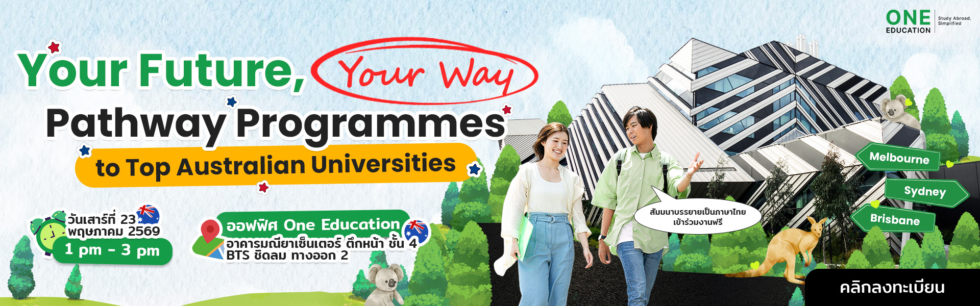 - สถานที่: ออฟฟิศ One Education อาคารมณียาเซ็นเตอร์ (ตึกหน้า) ชั้น 4, BTS ชิดลม ทางออก 2
